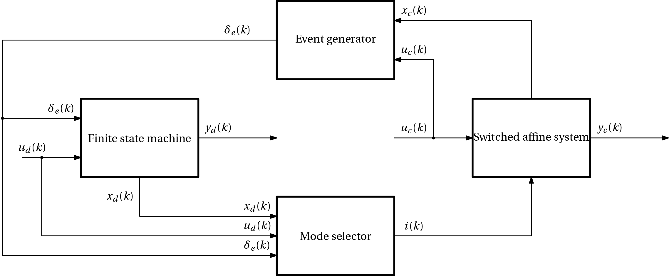\begin{aligned} \bm \delta_e(k) &= \mathbf h(\bm x_\mathrm{c}(k), \bm u_\mathrm{c}(k))\\ i(k) &= \mu(\bm x_\mathrm{d}(k), \bm u_\mathrm{d}(k), \bm \delta_e(k))\\ \bm y_\mathrm{c}(k) &= \mathbf C_{i(k)} \bm x_\mathrm{c}(k) + \mathbf D_{i(k)} \bm u_\mathrm{c}(k) + \mathbf g_{i(k)}\\ \bm y_\mathrm{d}(k) &= \mathbf g_\mathrm{d}(\bm x_\mathrm{d}(k), \bm u_\mathrm{d}(k), \bm \delta_e(k))\\ \bm x_\mathrm{c}(k+1) &= \mathbf A_{i(k)} \bm x_\mathrm{c}(k) + \mathbf B_{i(k)} \bm u_\mathrm{c}(k) + \mathbf f_{i(k)}\\ \bm x_\mathrm{d}(k+1) &= \mathbf f_\mathrm{d}(\bm x_\mathrm{d}(k),\bm u_\mathrm{d}(k),\bm \delta_e(k)). \end{aligned}